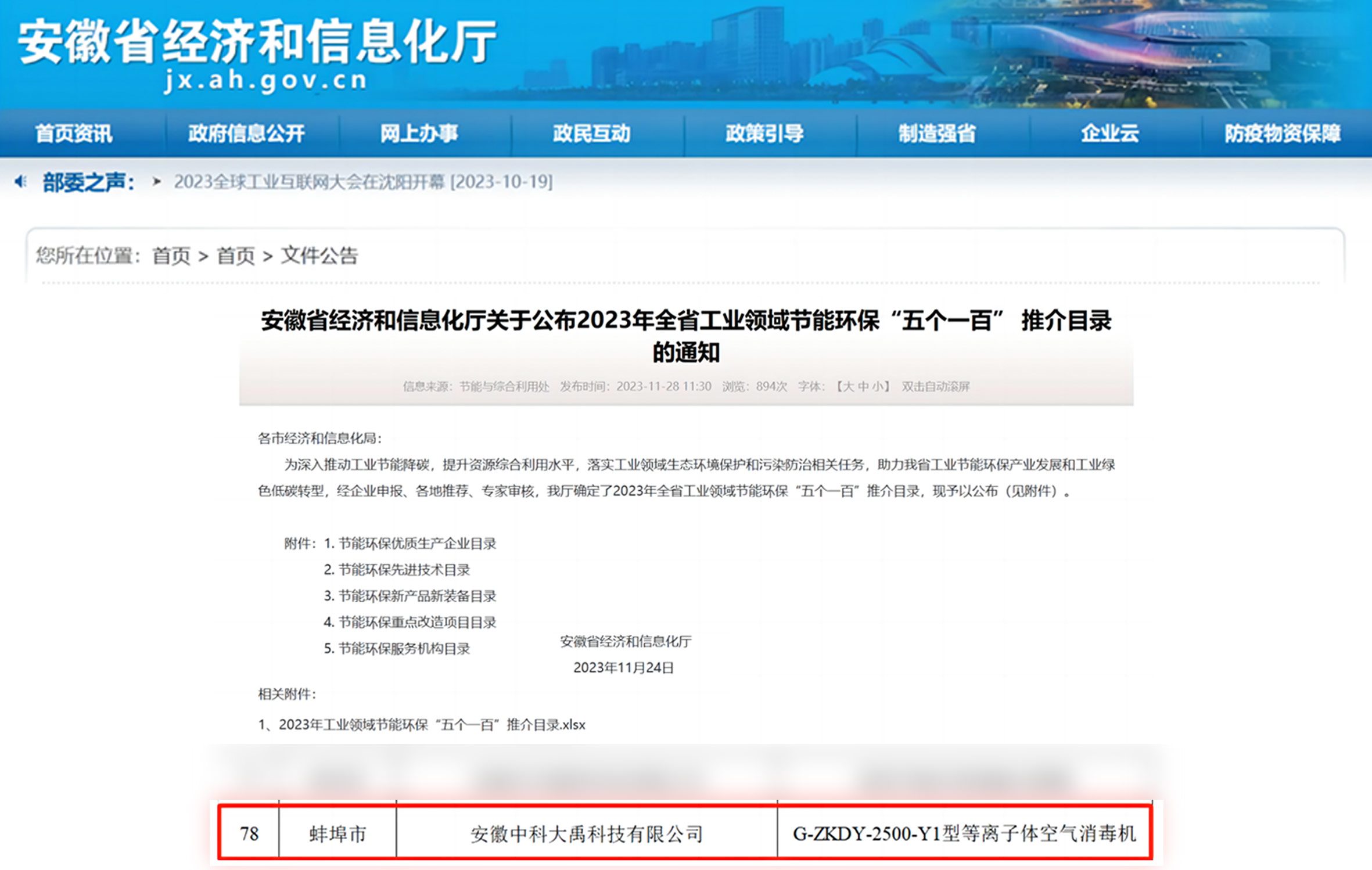 入選2023年全省工業(yè)領(lǐng)域節(jié)能環(huán)保“五個(gè)一百”推介目錄(節(jié)能環(huán)保新產(chǎn)品新裝備:G-ZKDY-2500-Y1型等離子體空氣消毒機(jī))